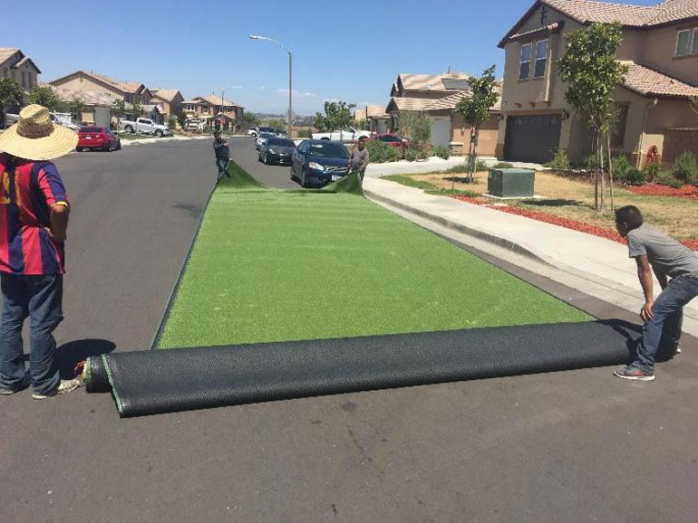 1. Disponga el césped. Mida el área donde se colocará el césped y el ancho y largo de las franjas de césped. Con un compañero, estire cada tira de césped y colóquela sobre la base preparada. Evite arrastrar el césped sobre la base, o podría alterar la superficie lisa.
